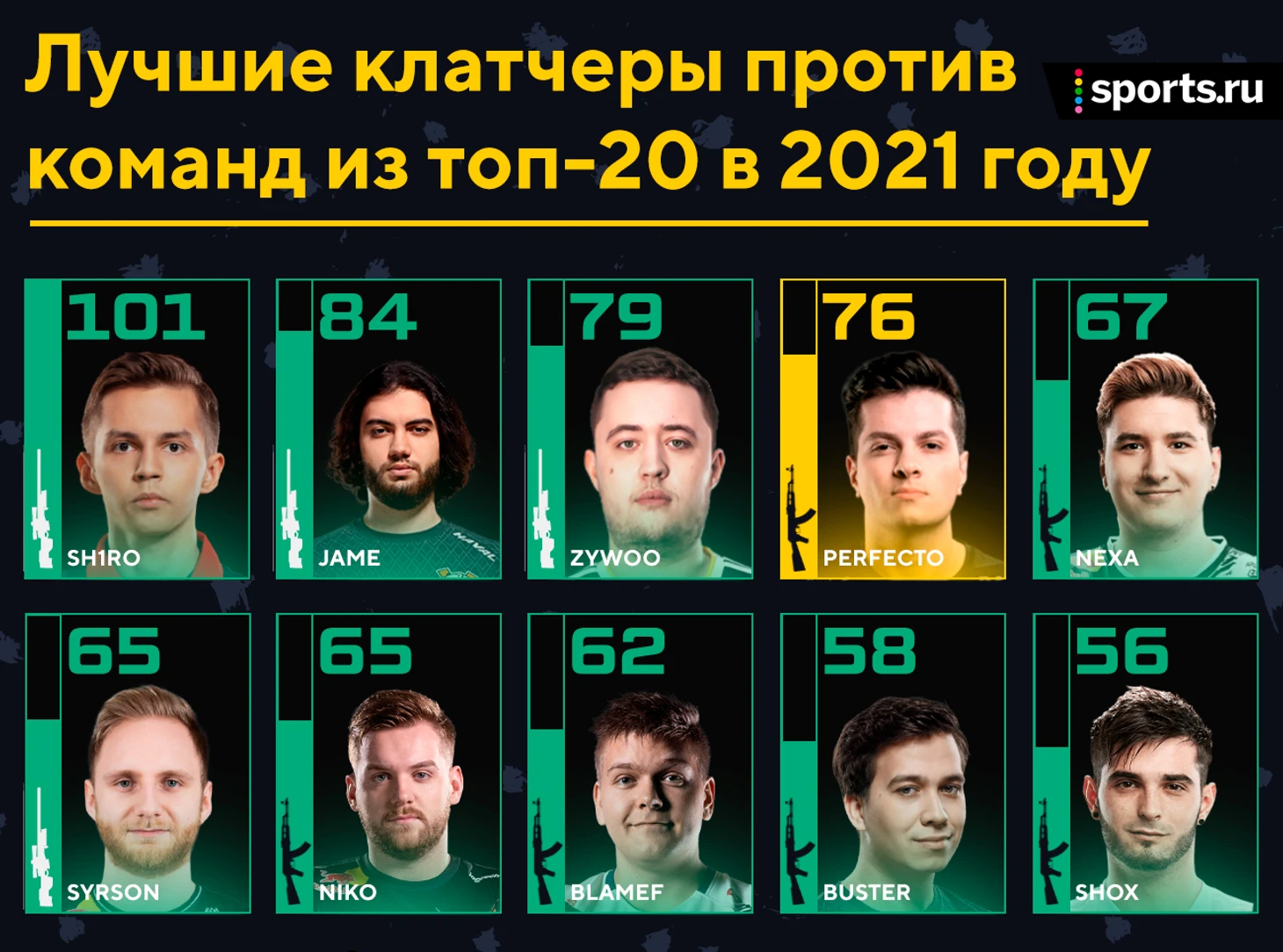 Если мы берем клатчи только против команд из топ-20 в 2021 году, то Perfecto – вновь один из лучших (76 клатчей). По этому показателю его превосходят только снайперы – Sh1ro из Gambit (101), Jame из Virtus.pro (84) и Zywoo из Vitality (79). Не зря Flamie называл Перфекто русским Зиппексом еще в 2020 году.