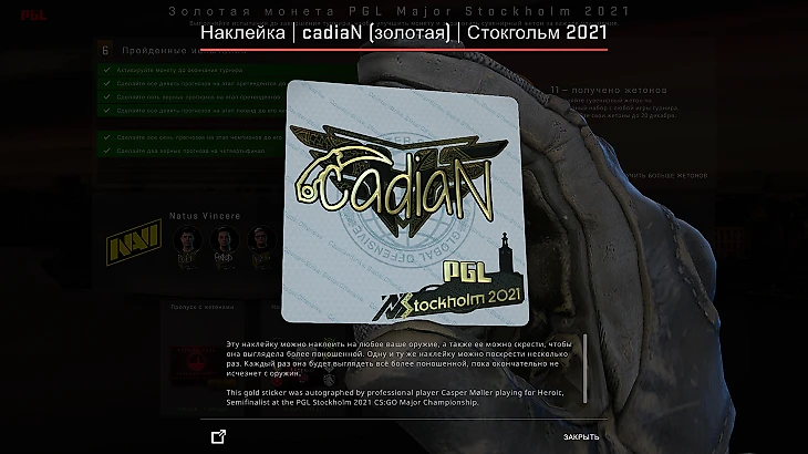 Cadian – единственный игрок, на стикере которого есть оружие из CS. Вероятно, эта отсылка к одному из лучших клатчей этого года, когда датчанин вытащил 1 в 4 против Gambit. Первый фраг он сделал с ножа.