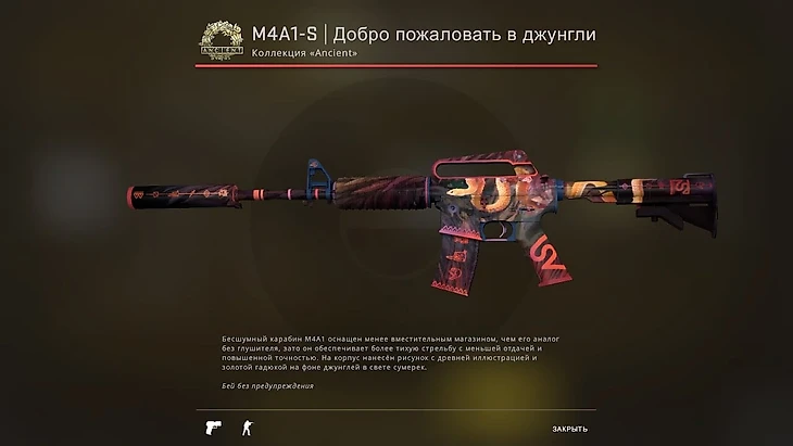 А вот M4A1-S Добро пожаловать в джунгли – очень редкий предмет из коллекции Ancient, в качестве «закаленное в боях» она стоит аж 70 тысяч рублей, а за идеальное качество придется отдать более 360 тысяч.