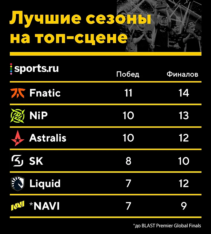 При этом, даже если не учитывать заслуги шведов в первые годы CS:GO, то NAVI все равно уступают Astralis. Датчане провели великолепный 2018 год, в котором заняли 1-е место на 10 турнирах, а еще в двух – доходили до финала. При этом все победы Astralis в том сезоне были на крупных чемпионатах. Даже если NAVI займут первое место на BLAST Premier Global Finals, они не догонят датчан по этому показателю.