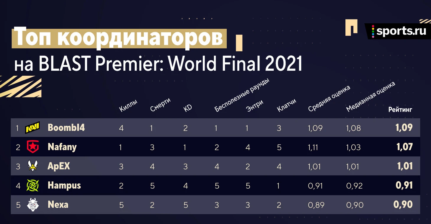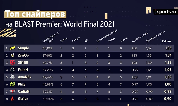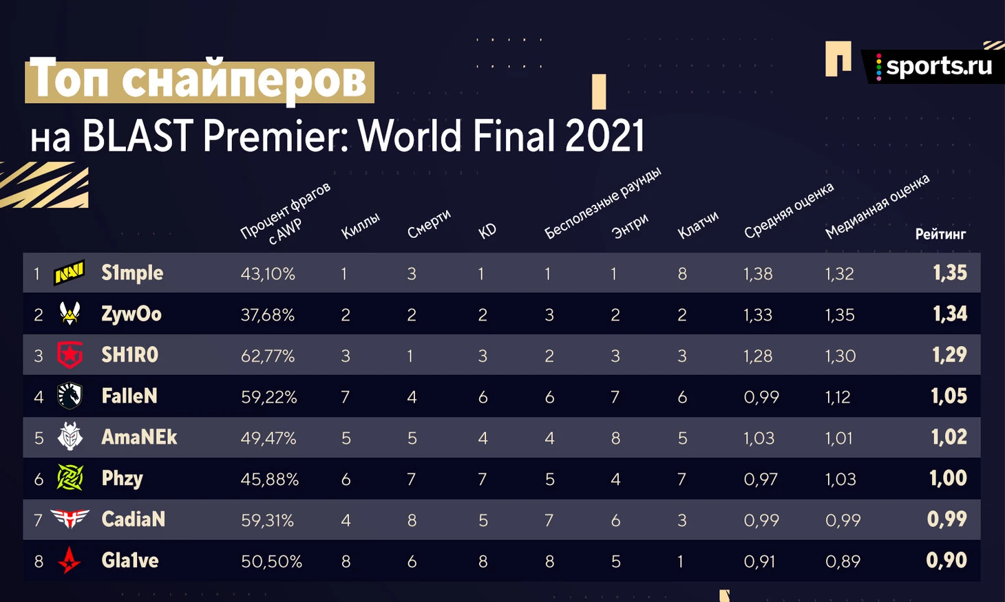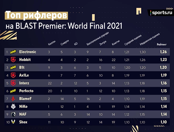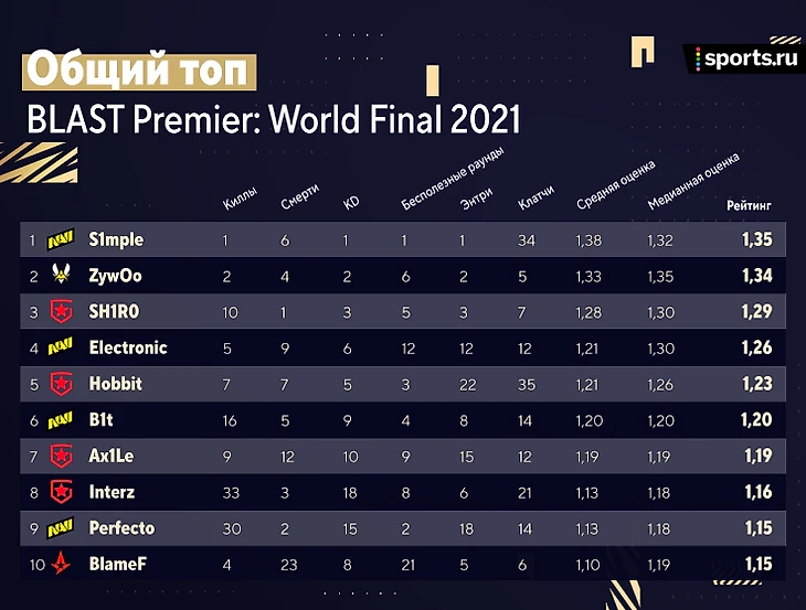 Но есть одно приятное исключение – Electronic, лучший рифлер Бласта. Стандартный показатель Дениса – 1,18. Но этот чемпионат Electronic сыграл на 1,26. Поэтому и вошел в четверку лучших. В целом NAVI в очередной раз доказали, что им нет равных на мировой арене.