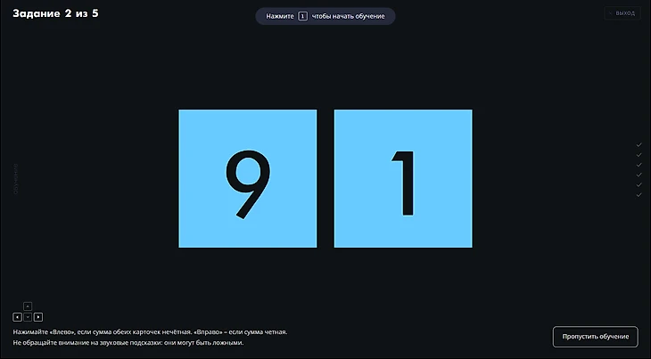 Всего в тесте пять заданий, перед каждым из которых можно запустить обучение. Примерная продолжительность теста: 10 минут. Очень важно проходить все задания в наушниках и строго следовать инструкциям – иначе результат может быть не объективен.