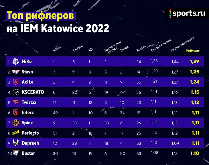 – Только S1mple идет в топ-10. Perfecto – 16-й, B1t – 32-й, Electronic – 48-й.