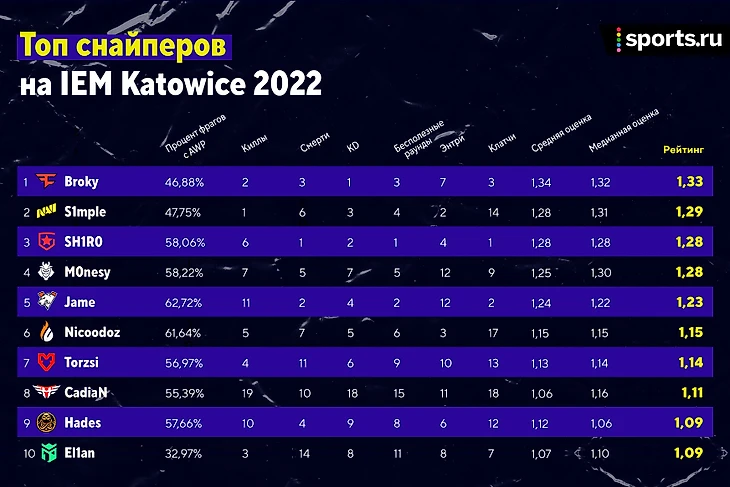– Симпл тащил, но чуть хуже, чем обычно. В среднем снайпер NAVI отыгрывает на 1,34. Сейчас закончил турнир с 1,29. Это плохой рейтинг для Саши, но все еще недосягаемый для всех остальных (кроме Broky).