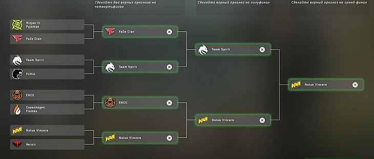 На этапе «новые чемпионы» необходимо правильно предугадать сетку плей-офф: как минимум 2 четвертьфинала, 1 полуфинал и финал.