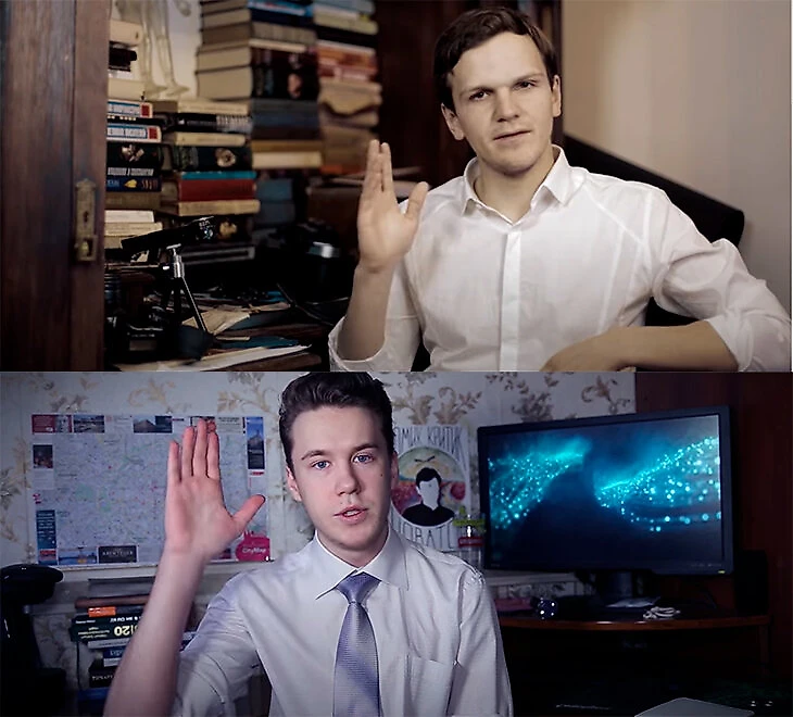 Если сравнивать построение кадра, то Райз буквально зеркалил поведение популярного блогера. В начале каждого ролика он поднимал правую руку и говорил: «Привет, друзья, с вами Райз». А Ларин начинал видео с такого же поднятия руки и приветствия: «Привет, ютуб, с вами Ларин».