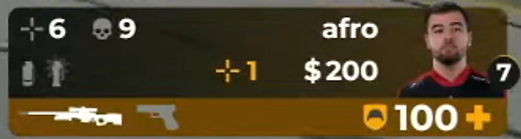 Значок прицела показывает количество фрагов (убийств) игрока, череп – смертей, а доллары – текущий баланс.