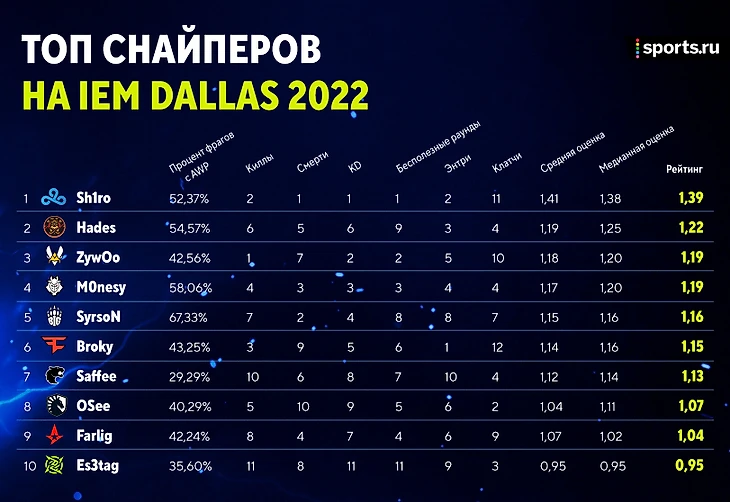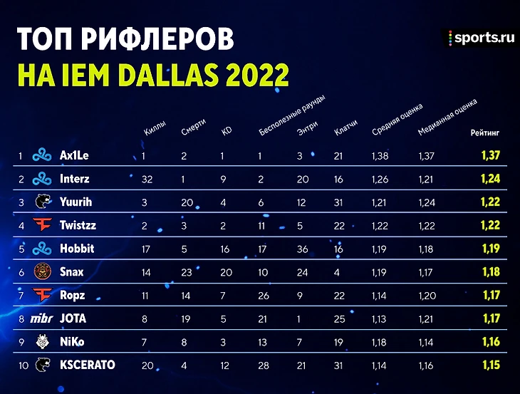 ★ Cloud9 показала невероятно высокий уровень в Далласе. 5 игроков в десятке лучших – выдающийся результат. Безусловно, главные герои – это Sh1ro и Ax1le. Снайпер C9 выдал лучший перформанс на турнире в 2022-м. Последний раз отметку в 1,39 по рейтингу превзошел S1mple на мейджоре в Стокгольме. Ax1le же отстал от Широ всего на 0,02 и занял третье место в топе самых крутых рейтингов года. На втором – все тот же S1mple с 1,38 за EPL S15.
