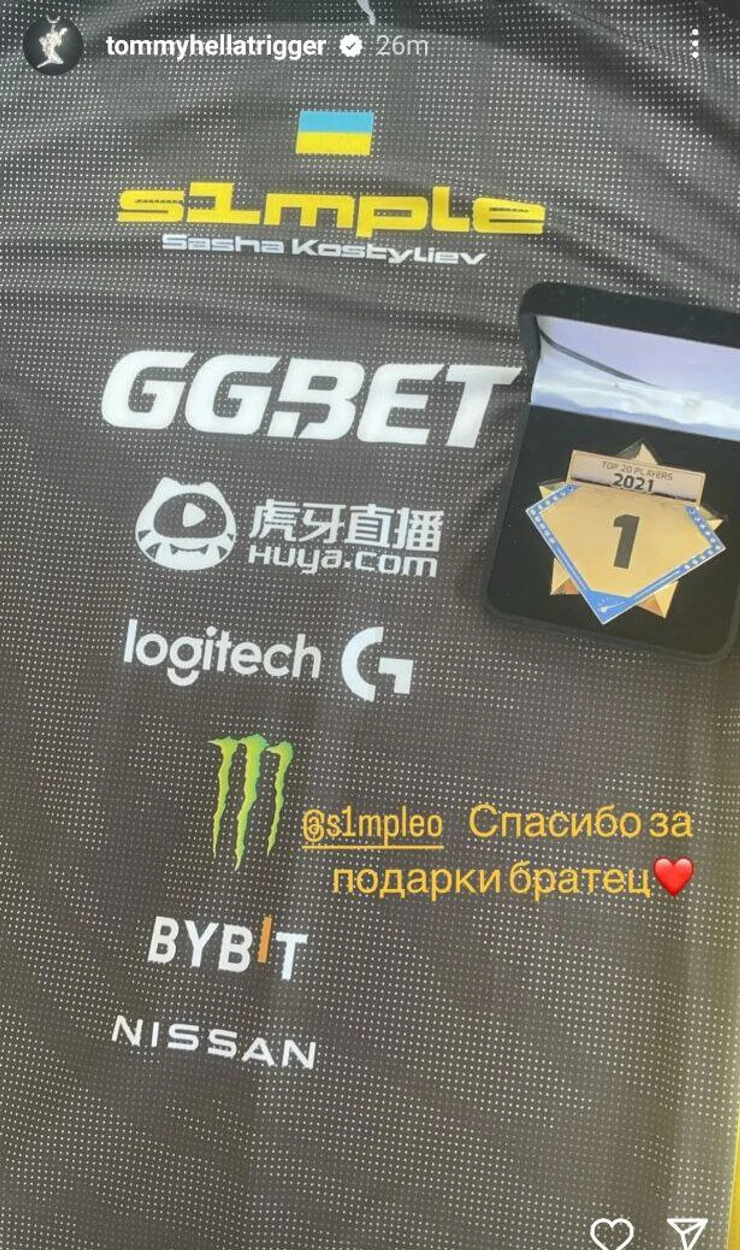 Вместо игры в CS Симпл отдыхал. Например, встретился с Кизару в Барселоне. И, похоже, подарил ему футболку и медаль за топ-1 в 2021 году.