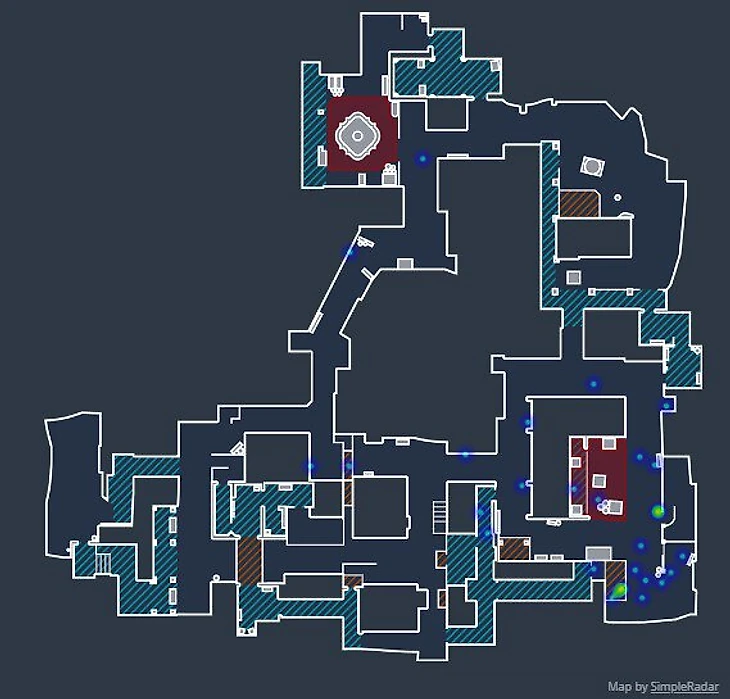 Такая расстановка легко справляется с любым выходом на точку. Задача игрока в больших песках – контролировать выход из апартаментов и байтить противников с шорта. Его тиммейт в «малых» не пропускает атаку в плент и контролирует лонг. Получается очень простой кроссфаер. Посмотрите на карту фрагов Электроника и Sdy в защите: как минимум треть фрагов они сделали с этих позиций.
