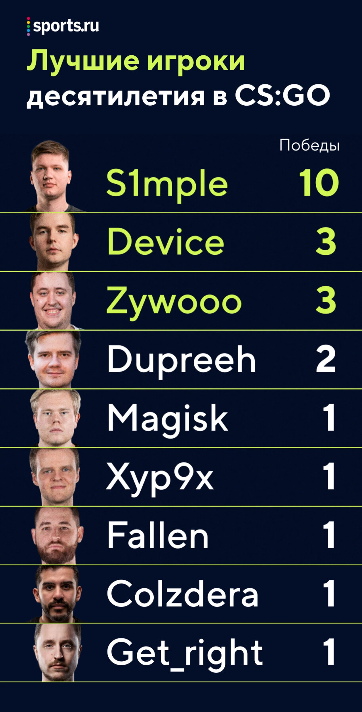 Но еще есть Девайс. Он 6 лет подряд входил в топ-5 игроков мира, причем 4 раза становился третьим, а однажды – вторым. Но все-таки он никогда не был первым и почти всегда играл с топовыми тиммейтами, поэтому балл забирает Симпл.