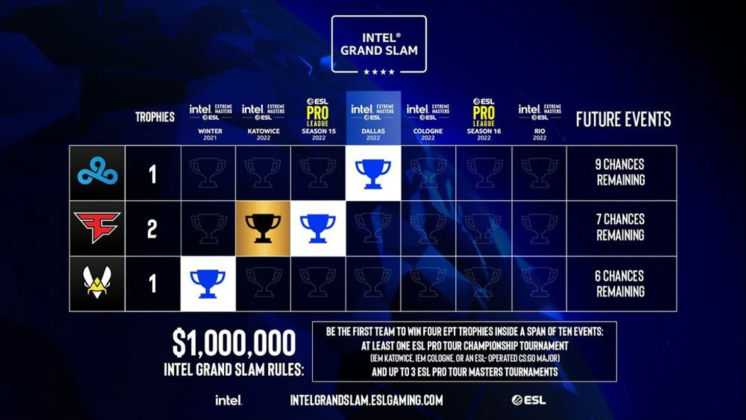 Сейчас идет уже четвертый сезон Intel Grand Slam – специального соревнования от ESL. Команда, выигравшая четыре турнира, получает 1 миллион долларов в виде золотых слитков, но есть важное условие – хотя бы одна победа должна быть на Катовице, Кельне или мейджоре от ESL.