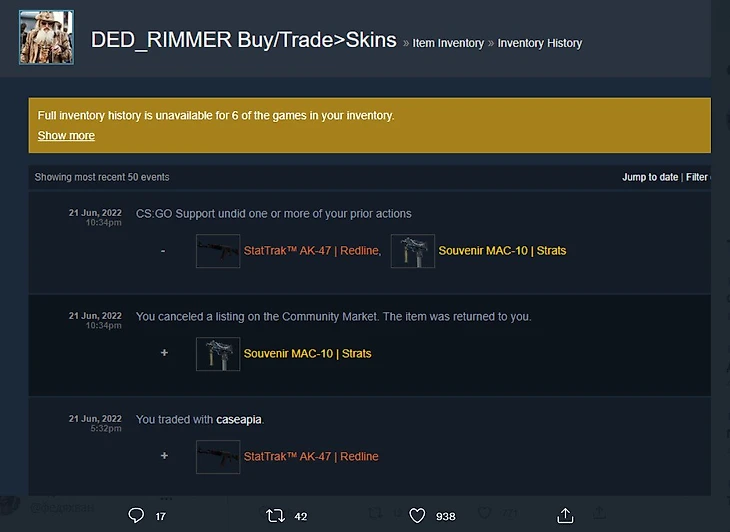 Но уже через несколько часов об этом узнали разработчики CS:GO, здесь им помогли посты в Твиттере от известных инвесторов и трейдеров скинов. Valve тут же отменила все трейды и вернула украденные скины на аккаунт владельца. А купившие предметы люди, во-первых, лишились их навсегда, а во-вторых, получили бан сообщества: запрет на добавление новых друзей и ограничение доступа к трейдам и официальной торговой площадке.