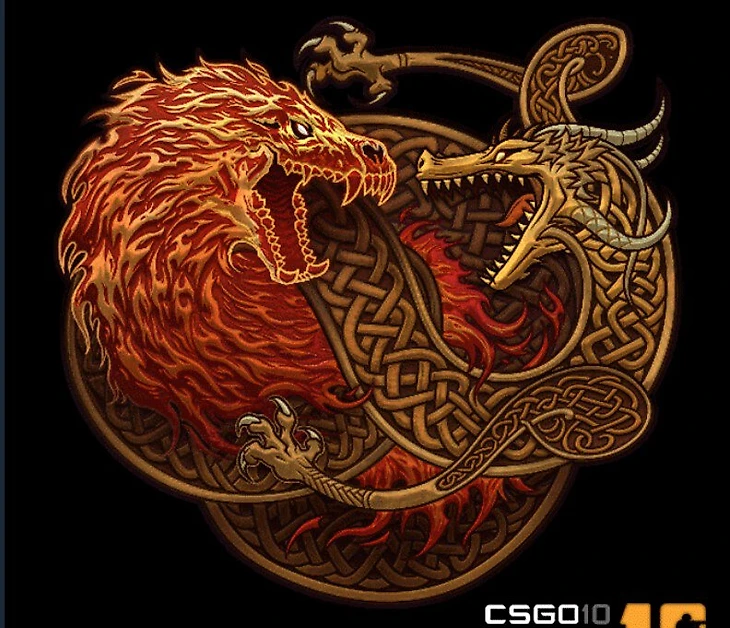 Драгон Лор и Вой – самые дорогие скины на пушки в CS:GO. Более того, за это время они стали не просто легендарными, а культовыми и известными даже вне CS. Неудивительно, что одна из самых популярных наклеек связана с противостоянием существ с этих пушек.