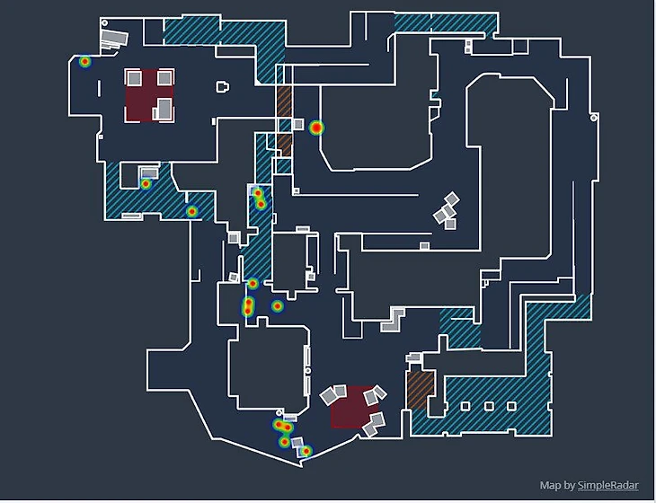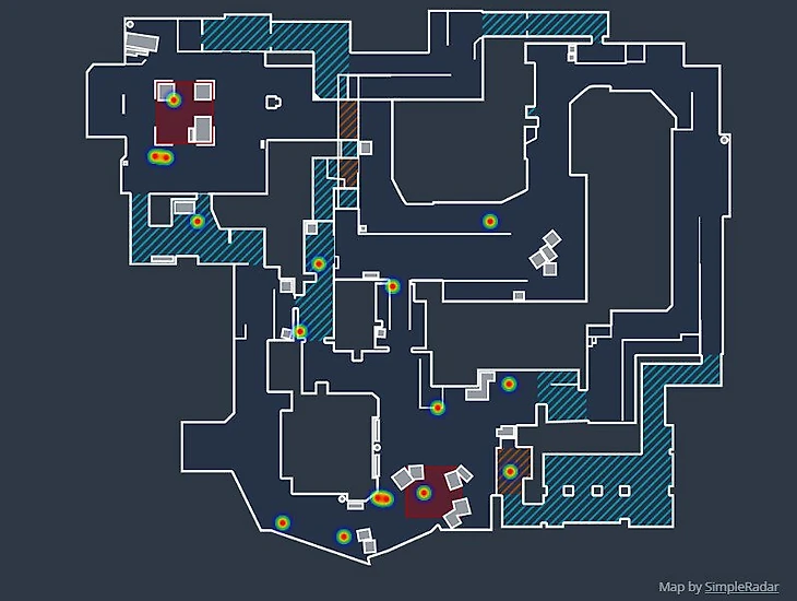 Как видно по карте фрагов, Хэдтрик в защите был идеальным опорником точки А. Делал фраги с джангла, с КТ, но при этом помогал и под точкой Б. И Симпл всегда играет точно также, видимо Даниил посмотрел много демок Костылева. В последнем раунде он спас NAVI от овертаймов тремя красивыми фрагами с шорта.