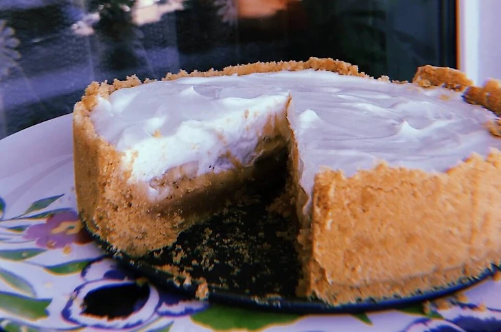 5) Ровным слоем выложить крем в форму на бананы. Убрать готовый пирог в холодильник минимум на 3 часа, лучше на ночь. Если тесто плохо застынет, то при извлечении из формы стенки пирога могут упасть.