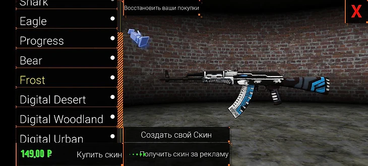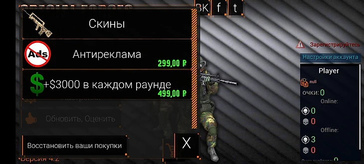 В магазине можно купить скины на пушки, многие из которых взяты из CS. А также несколько необычных товаров: отключение рекламы за 300 рублей и пополнение баланса в каждом раунде на 3 тысячи долларов за 500 рублей.