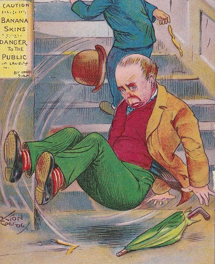 В 1879 году в популярном журнале Harper’s Weekly вышла статья, где критиковали людей, которые выбрасывают кожуру от банана на улице. «Вы причиняете большое зло обществу и, вполне вероятно, несете ответственность за сломанную конечность», – обращалась газета к хулиганам. В New York Times в то же время печатали новости о несчастных случаях: «Богатый торговец в возрасте 75 лет поскользнулся на банановой кожуре перед своим домом и сломал шейку бедра. Вряд ли он выздоровеет». В газету часто писали разгневанные писатели, требуя вообще запретить продажу бананов.