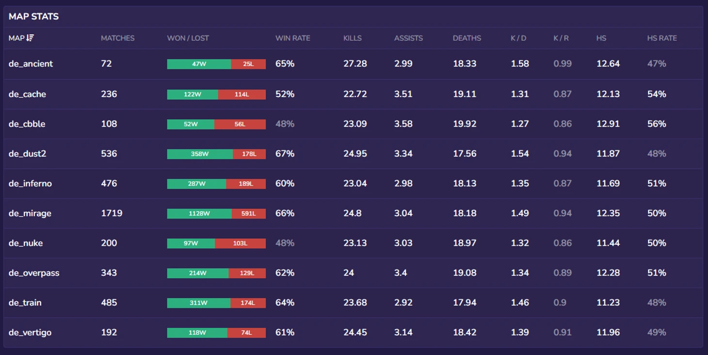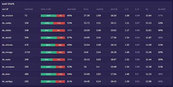 Следующий блок – Map Stats, в котором агрегируется вся информация о самых удачных картах игрока.