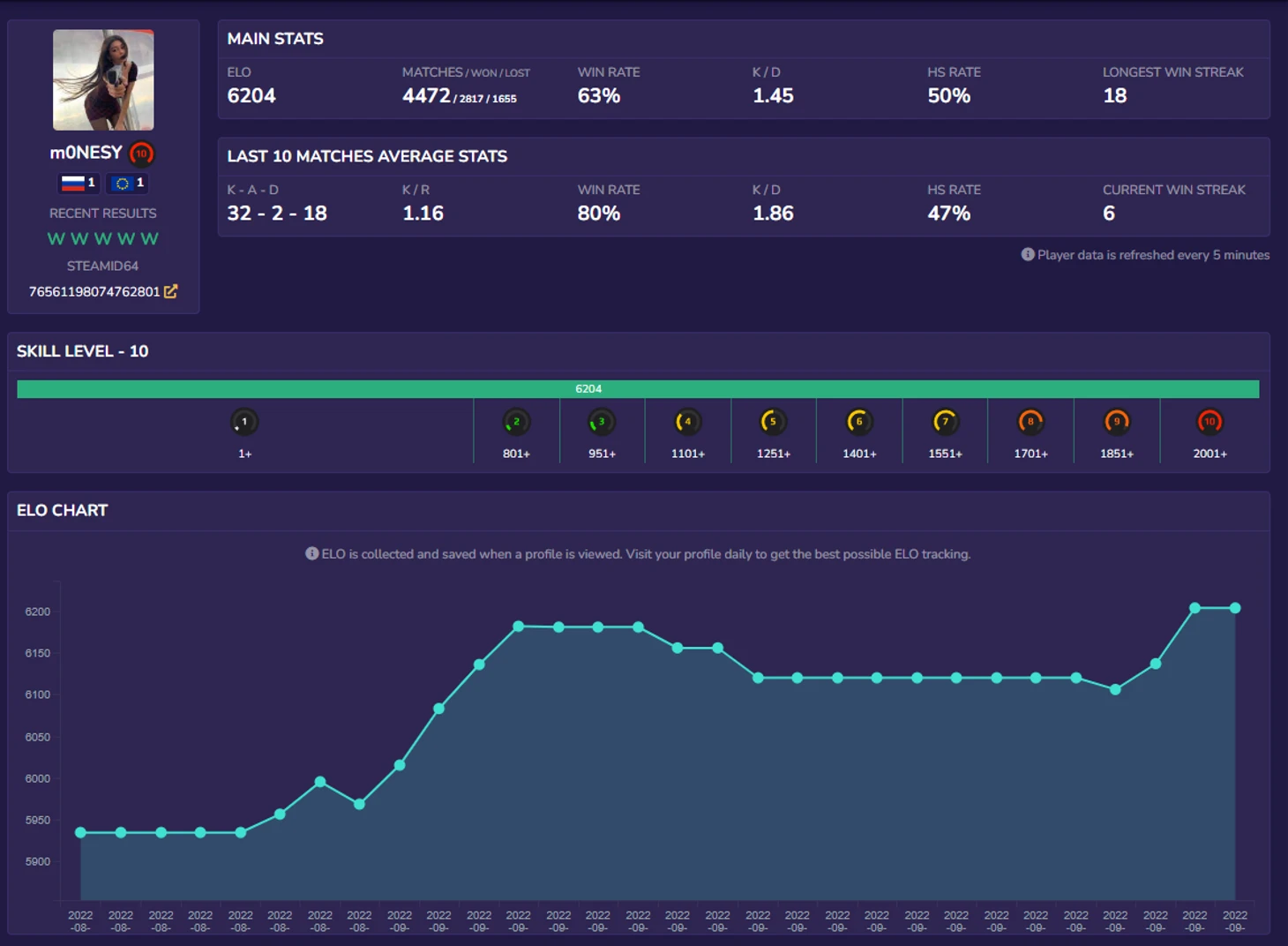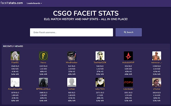 faceitstats.com – трекер Фейсит статистики, позволяющий посмотреть статистическую информацию о любом игроке на платформе, начиная с лучших игроков платформы, и заканчивая 6к Elo, заканчивая другом в пати, штурмующим тыщу ретинга уже третий год.