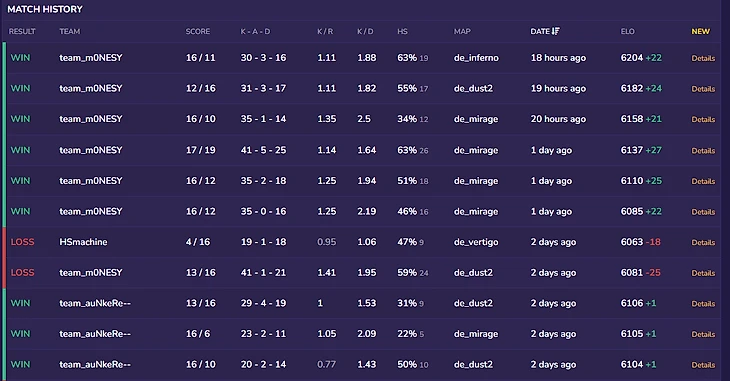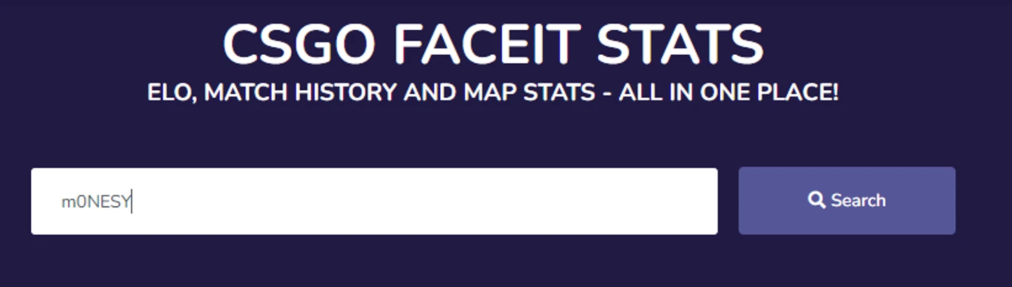 Чтобы воспользоваться Фейситстатс, просто введите в строчку поиска юзернейм любого игрока на Faceit. Давайте рассмотрим трекер статистики на примере M0nesy.