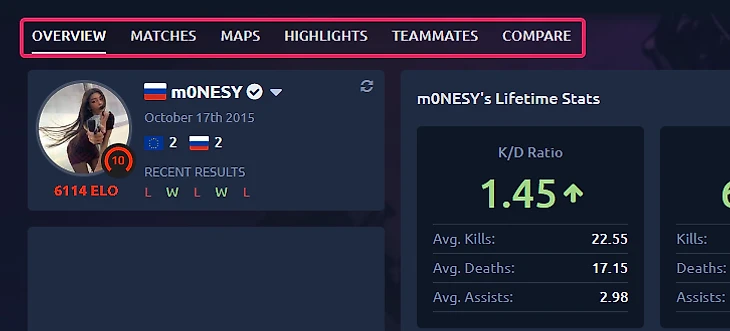 Пройдемся по блокам статистики, доступным на Faceit Tracker: