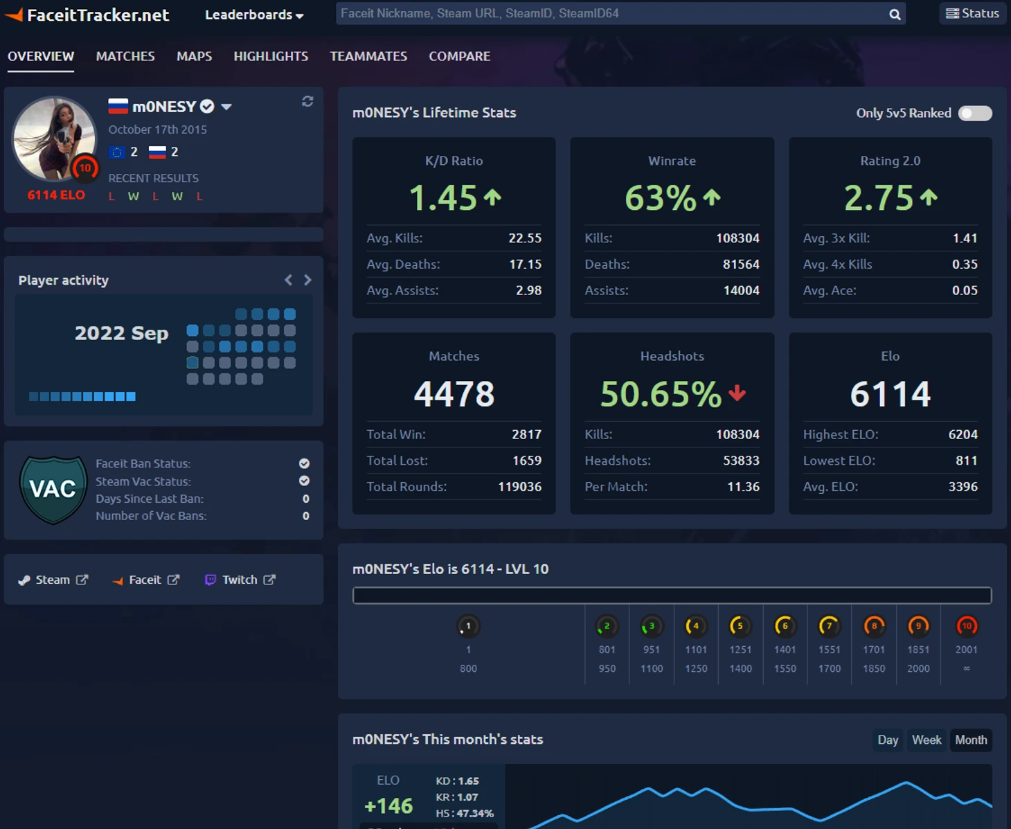 После этого идет текущее Эло игрока и его расположение на шкале скилла, а также статистика игрока в текущем месяце/неделе/дне и последние матчи.