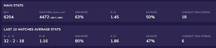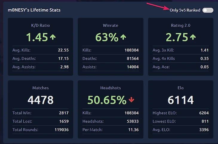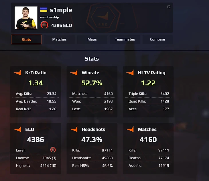 Как правило, смотрят на самые важные статистические показатели, которые показывают скилл игрока в CS:GO – это киллы, смерти, ассисты, хедшоты, общий винрейт и ряд других показателей. Например, как часто каэсер берет клатчи в меньшинстве.