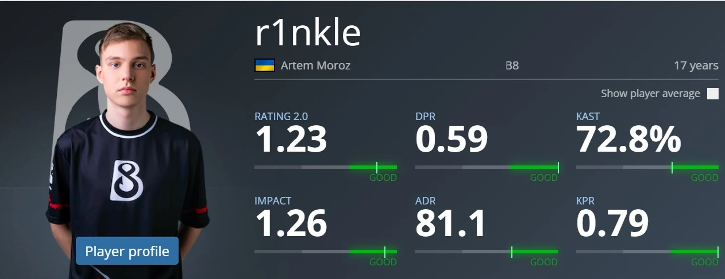 мини-симпл, да и 1 в нике намекает на кумира. Классный снайпер, которому главное не засидеться в составах уровня B8. Эту команду он уже перерос. Умеет сыграть и агрессивно, и спокойно, когда надо. Учитывая что ему всего 17, явно лакомый кусок для многих команд, правда в СНГ-регионе сейчас идти некуда, надо смотреть в сторону Европы.