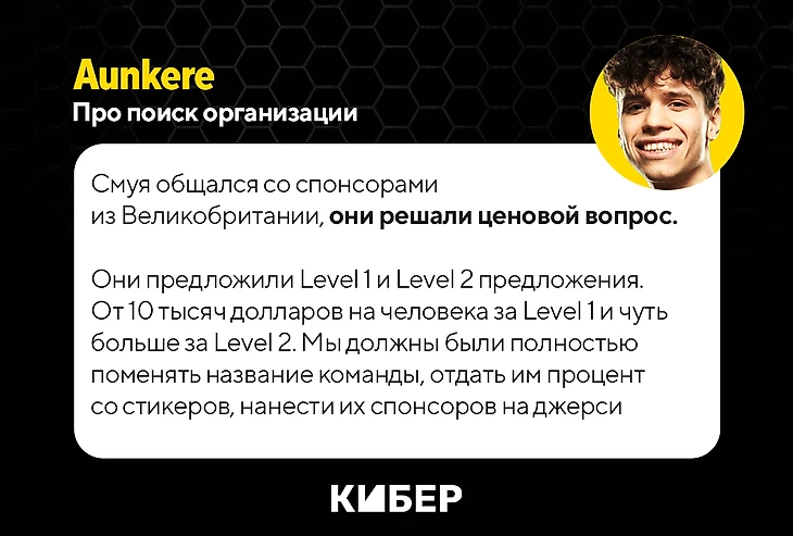 – Объясню: у нас были запросы от европейских сторон. Смуя общался со спонсорами с Великобритании, они решали ценовой вопрос. Они дали предложения Level 1 и Level 2. От 10 тысяч долларов на человека за Level 1 и чуть больше за Level 2. Мы должны были полностью поменять название команды, отдать им процент со стикеров, нанести их спонсоров на джерси.