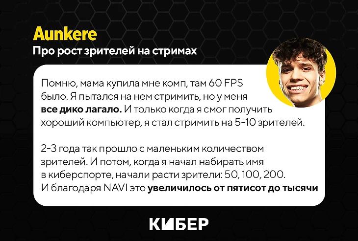 – Я изначально хотел стримить, когда только узнал о CS. Я смотрел Калашзора, Читбаннеда. Смотрел их поначалу, тогда еще даже не играл в CS. Мне нравилось, как они общались со зрителями. У меня тогда был ужасный компьютер или его вообще не было. Соответственно, я тоже хотел стримить. Помню, мама купила мне комп, там 60 FPS было. Я пытался на нем стримить, но у меня все дико лагало. И только когда я получил хороший компьютер, я стал стримить на 5-10 зрителей. 2-3 года так прошло с маленьким количеством зрителей. И потом, когда я начал набирать имя в киберспорте, стали расти зрители: 50, 100, 200. И благодаря NAVI это увеличилось от пятисот до тысячи.