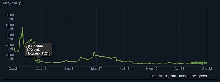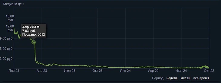 Зимой 2020 года вышли наклейки РМР-сезона. И они мгновенно обрушились в цене: продавались в лучшем случае за несколько рублей, порой даже за копейки. Люди закупили чересчур много наклеек, а для продажи не боялись демпинговать рынок. В итоге, даже спустя 2 года наклейки все еще на дне, а цена постепенно продолжает падать: от 7-8 рублей на старте до 0,5-1 рубля сейчас.