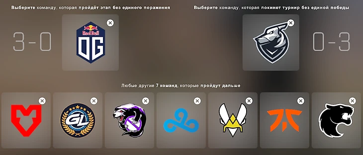 На 3-0 можем поставить команду, в которой мы не уверены. Но при этом у них есть шансы обыграть любого в bo1, например. Для меня это несколько команд - OG, MOUZ, GamerLegion и FURIA. Выбирайте из них кого угодно, лично я выбрал команду nexa. Потенциально в рамках одной карты OG могут обыграть любого. При этом до конца не понятно, сможет ли команда продолжить набирать форму.