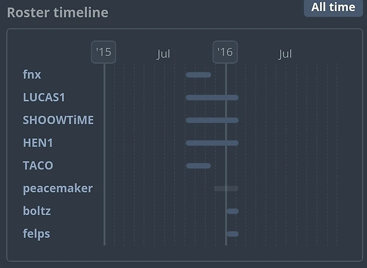 Еще один бывший игрок mTw у руля команды - trace. Датчанин получил известность в предыдущей версии игры, играя в составе уже упомянутых mTw. trace был одним из лучших игроков команды в 2010-2011 годах, заняв третье и четвертое места в рейтинге лучших игроков года.