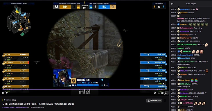Во время киберспортивных трансляций в чате постоянно спамят фразами, подходящими под текущую ситуацию в матче. В мемных сообщениях восхваляют либо посмеиваются над игроками, командами или техническими проблемами. А во время матчей с участием команд из Бразилии в чате постоянно всплывает сообщение «Bra71l».