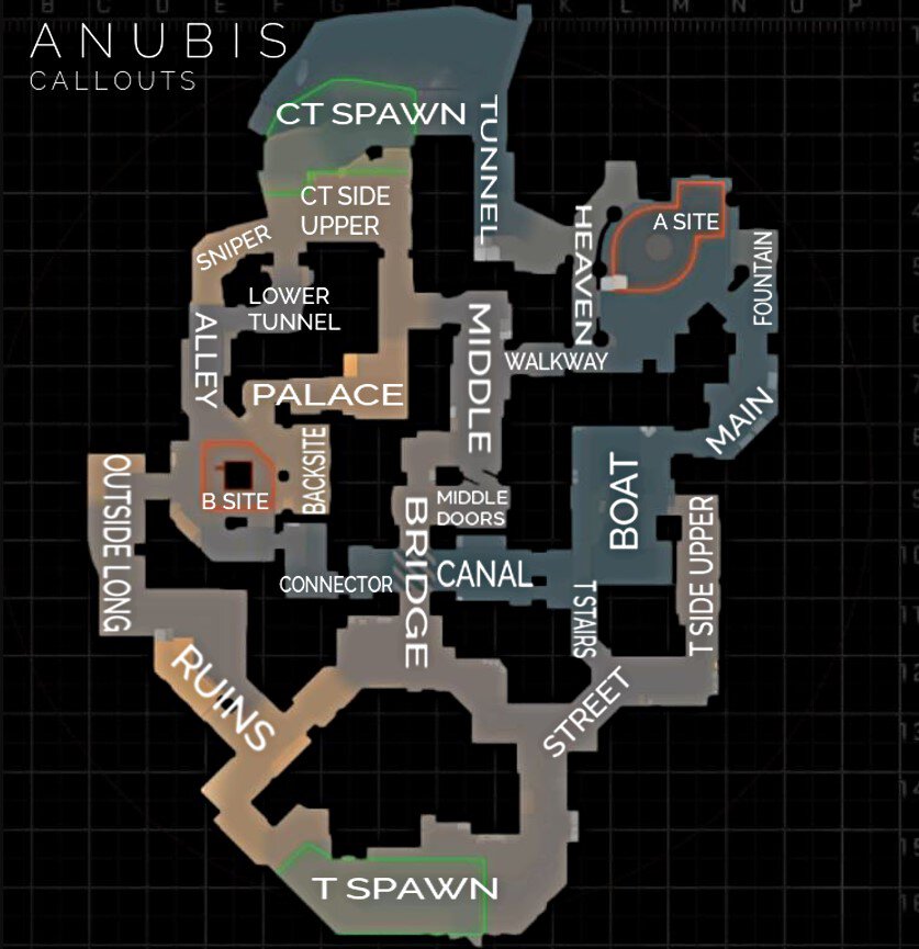 Карта Anubis стала очень популярной после обновления маппула. Но многие игроки не знают коллы на новой локации, а официальные названия не подходят для обычных игр. Поэтому лучше заранее изучить карту с названиями позиций как на русском, так и на английском языке.