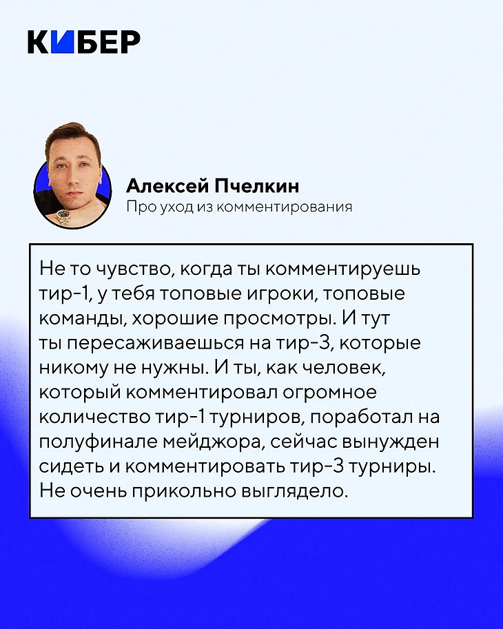 Комьюнити каэсерское – в нем нет жизни, оно мертвое. Там не происходит спадов, перепадов, всплесков. Оно существует и все. И когда происходит Леша Пчелкин с АТК, оно все взрывается: «Да как комментатор может так говорить, комментатор должен комментировать». Они все такие, мертвенькие немножко, безжизненные. Это не очень круто, как по мне.