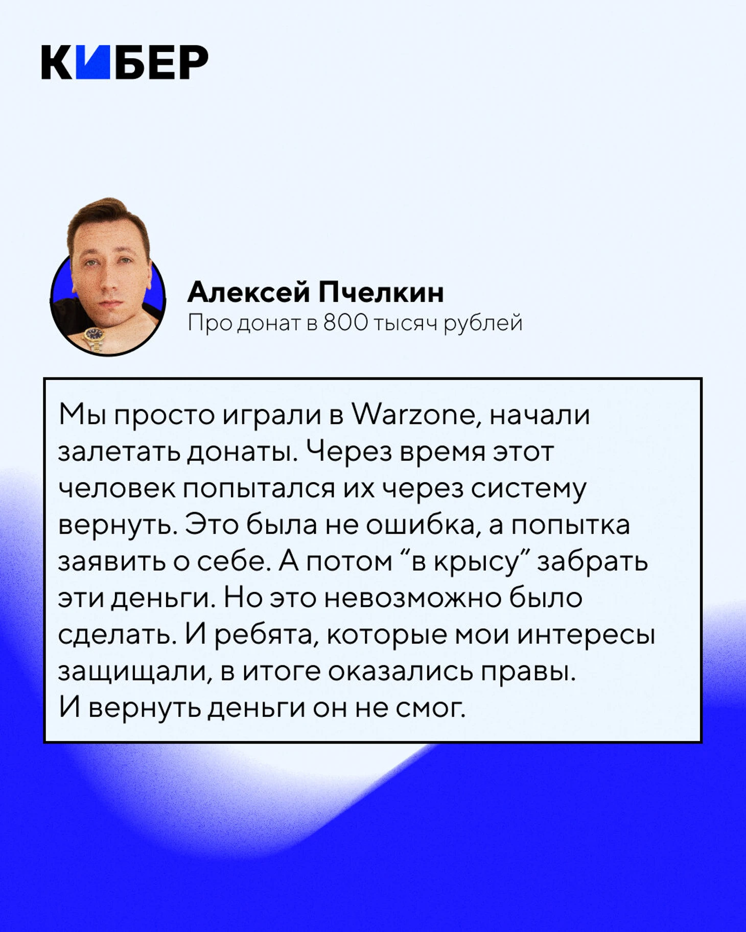 – Нет. Мы с Симплом просто играли в Warzone, начали залетать донаты. Симпл физически не мог этого сделать, а спустя время этот человек попытался их через систему вернуть. Понятное дело, это была не ошибка, а попытка заявить о себе. А потом «в крысу» забрать эти деньги. Но это невозможно было сделать. Во-первых, на этой площадке не отзываются деньги, там с предупреждением пишут, что ты отправляешь деньги и несешь за это ответственность. Во-вторых, деньги, которые он задонатил, уже были пущены в дело, то есть вернуть их никто не мог. В-третьих, когда я об этом узнал, ребята сказали, что уже разбираются, ведут переговоры с этим человеком.