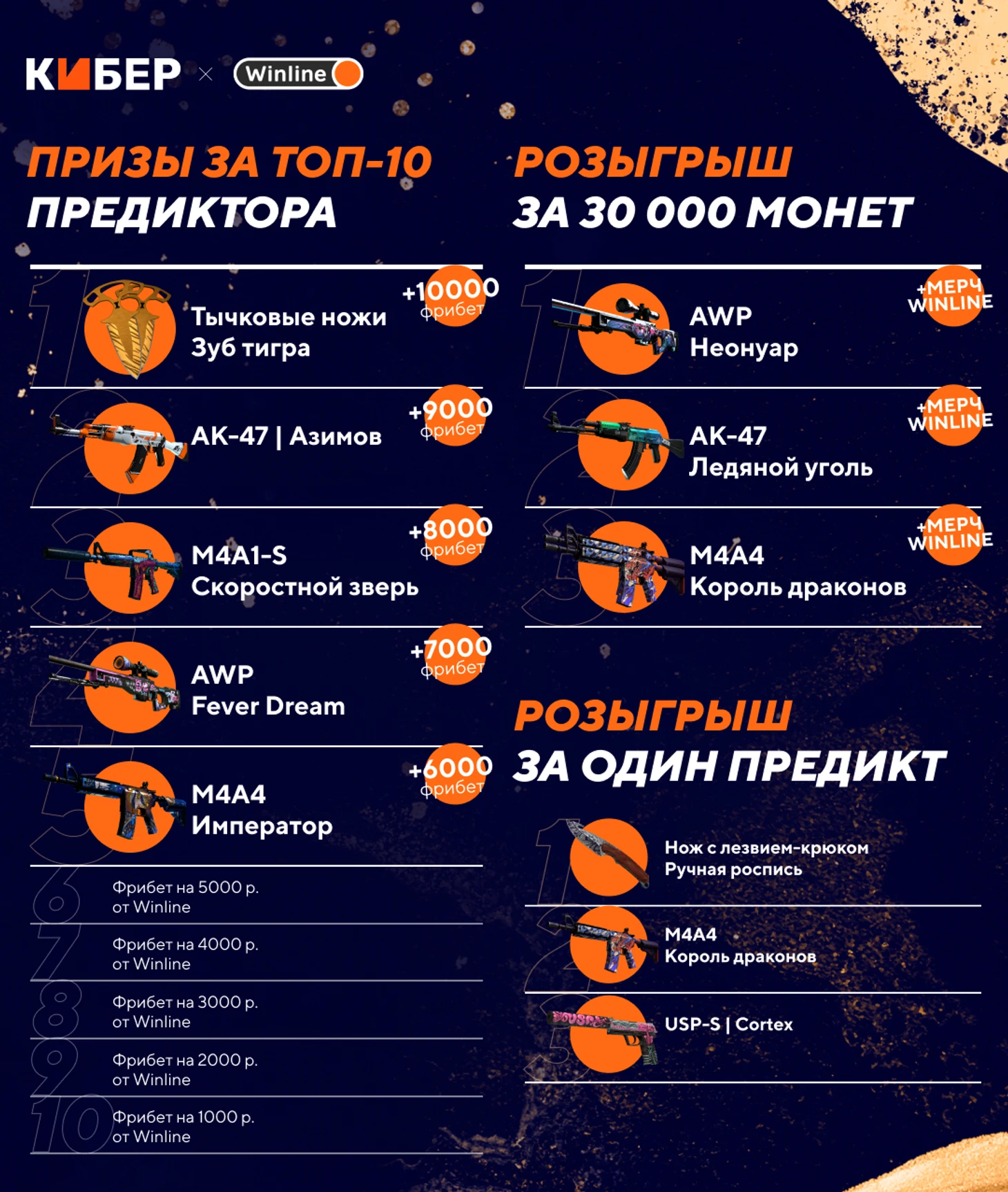 1. AWP | Неонуар + набор мерча от Winline 2. AK-47 | Ледяной уголь + набор мерча от Winline 3. M4A4 | Король драконов + набор мерча от Winline
