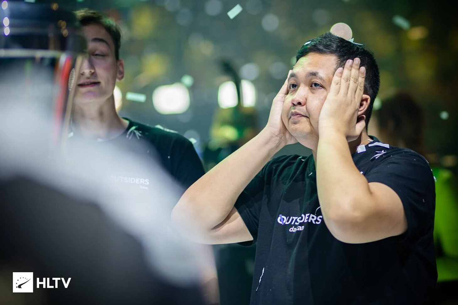 Но главное открытие из тимспика команды – Dastan. Вот каким вы представляете тренера Outsiders? Тихий человек, который, может, и вносит тактический импакт в игру, но вряд ли выступает с мотивационными речами. А вот и нет. Только почитайте, что он говорит (можете и послушать: на канале Джейма. Мы не можем вставить видео из-за мата).