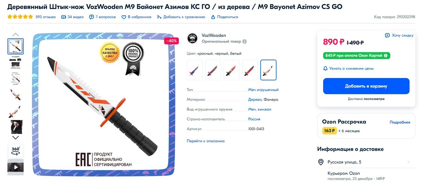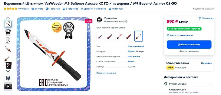 На маркетплейсах продается множество предметов из CS:GO, сделанных из дерева. Самый популярный и дешевый вариант – нож. Например, необычный Штык-нож в раскраске «Азимов» можно купить меньше, чем за тысячу рублей.