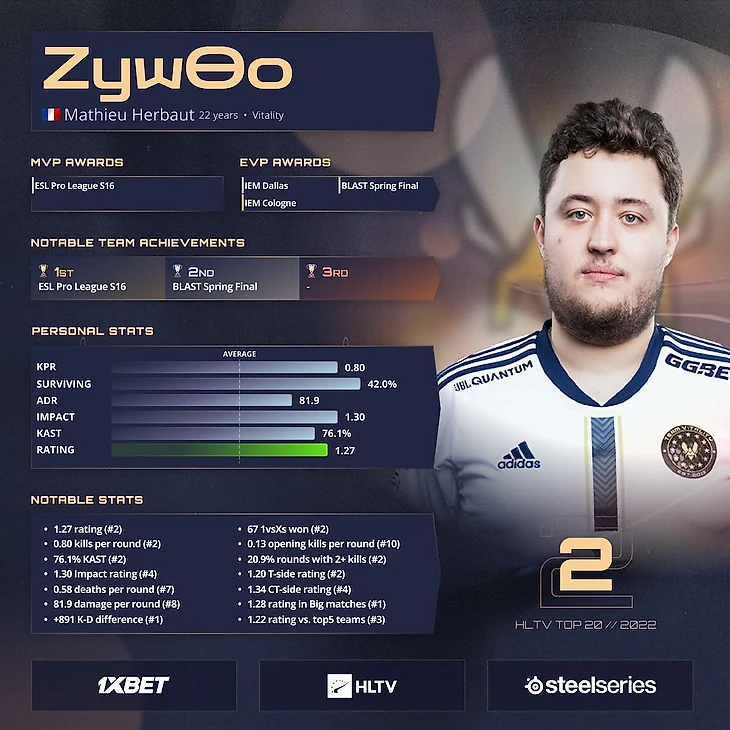 В прошлом году француз также расположился на второй строчке в рейтинге. Вместе с командой Эрбо выиграл ESL Pro League Season 16 и занял 2-е место на BLAST Premier: Spring Finals 2022.