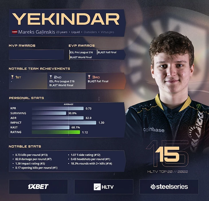 Вместе с Liquid Yekindar занял второе место на ESL Pro League Season 16 и BLAST Premier World Final 2022. В 2022 году его средний рейтинг составил 1,12.