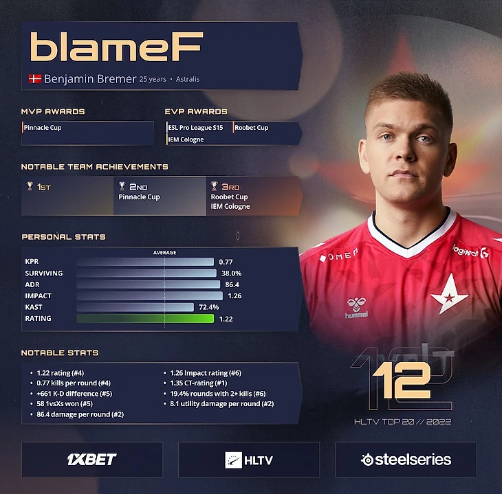 Cредний рейтинг Бенджамина за 2022 год – 1,22. Astralis c BlameF стала топ-8 на IEM Katowice 2022 и ESL Pro League Season 15, а также топ-4 на IEM Cologne 2022. BlameF был признан самым ценным игроком Pinnacle Cup Championship.