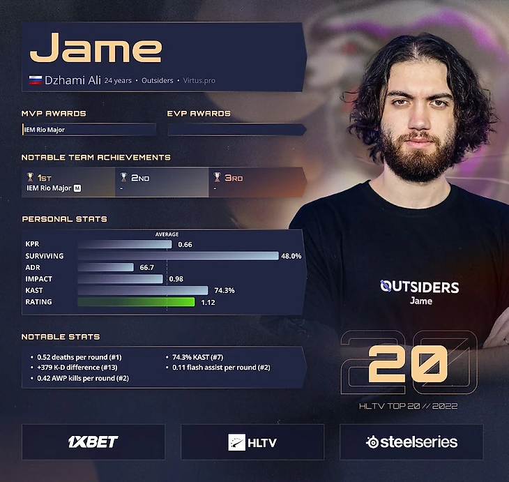 В прошедшем сезоне Jame выиграл IEM Rio Major 2022, а также стал его MVP.