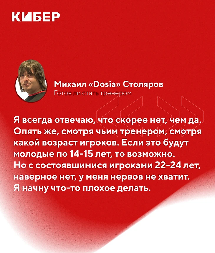 – Да, началось такое. Я начал по-другому играть. Чем опытнее становишься, тем осторожнее играешь. И где-то это плюс, но нынешнему CS:GO это не помогает. Молодые горящие умы перестреливают, просто выбегают. Надо как-то удивлять, а взрослые игроки ждут, пока их удивят.