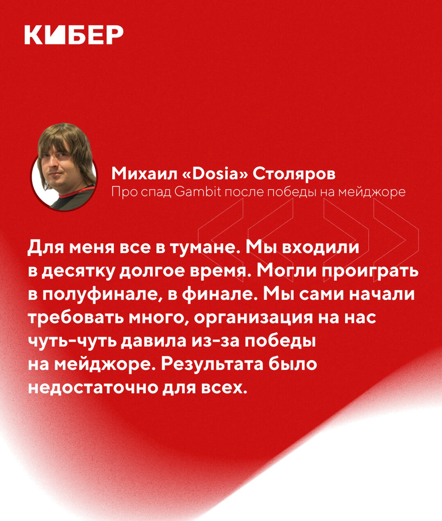 Dosia – легендарный игрок, про которого слышал каждый, кто хоть немного следит за CS:GO. В 2013-м он попал в пятерку лучших игроков года, а в 2017-м выиграл мейджор вместе с Gambit. Сейчас Михаил в запасе у Forward, вместе с которой почти попал на РМР к IEM Rio Major. Он регулярно стримит, растит дочь и не планирует завязывать с CS:GO. Я поговорил с Досей о его текущей карьере, мы вспомнили победу на мейджоре, уход Зевса и покупку автомойки.