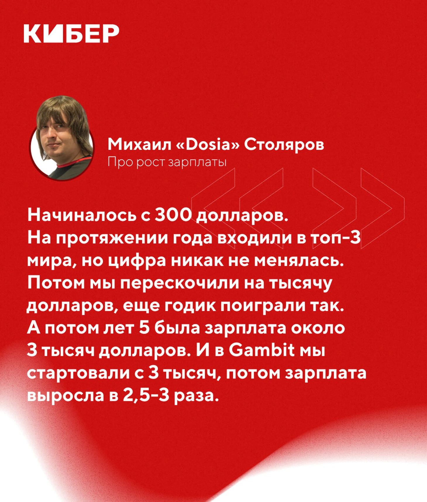 – Начиналось с 300 долларов. На протяжении года входили в топ-3 мира, но цифра никак не менялась. Потом мы перескочили на тысячу долларов, еще годик поиграли так. А потом лет 5 была зарплата около 3 тысяч долларов. И в Gambit мы стартовали с 3 тысяч, потом зарплата выросла в 2,5-3 раза.