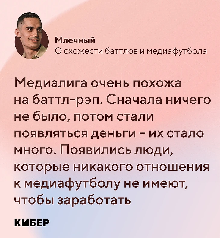 – Она очень похожа на баттл-рэп. Сначала ничего не было, потом стали появляться деньги – их стало много. Появились люди, которые никакого отношения к медиафутболу не имеют, чтобы заработать. Появилось очень большое количество контента. Настолько, что ютуб перегружен контентом про медиафутбол. А зачастую он еще и некачественный.