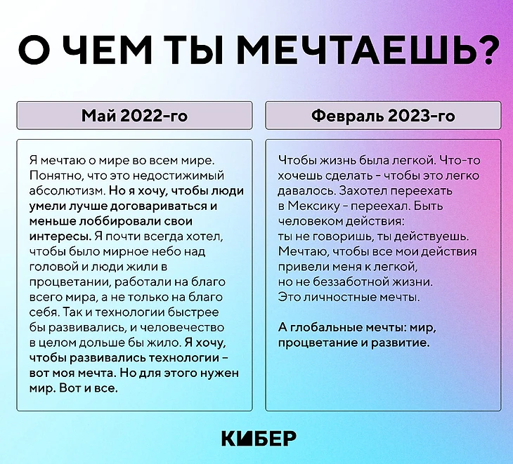 – Чтобы жизнь была легкой. Что-то хочешь сделать – чтобы это легко давалось. Захотел переехать в Мексику – переехал. Быть человеком действия: ты не говоришь, ты действуешь. Мечтаю, чтобы все мои действия привели меня к легкой, но не беззаботной жизни. Это личностные мечты.